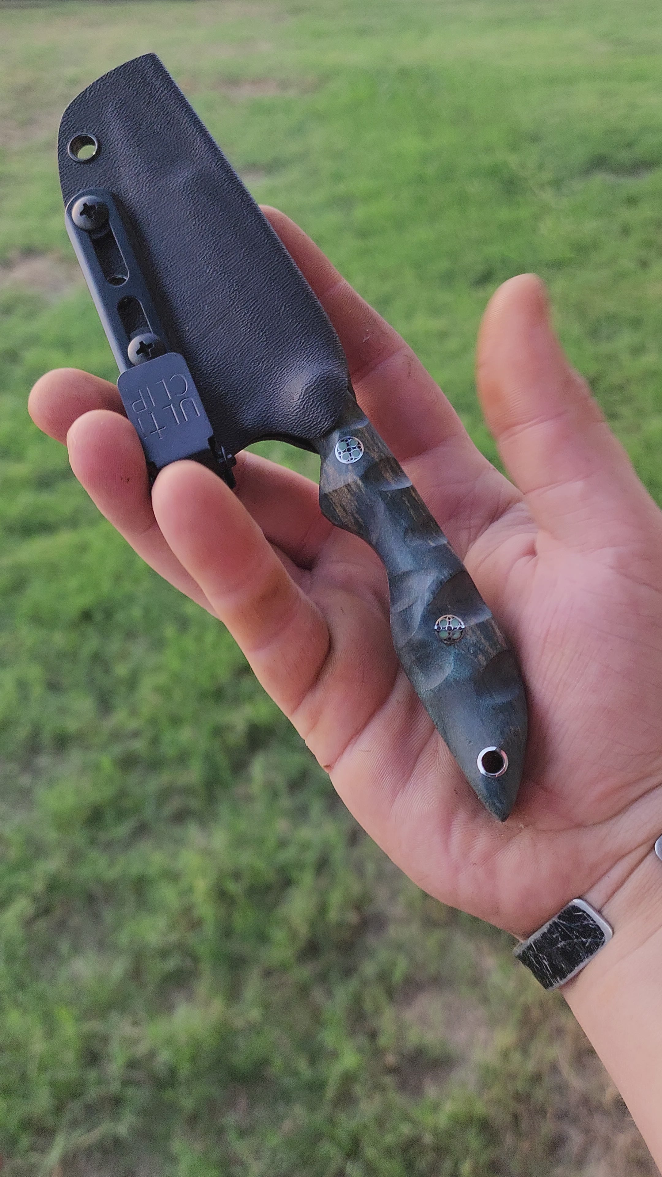 A Sliver in 1/8 80crv2 with Blue Quilted maple scales, Mosaic Glow in the dark pins, stainless steel lanyard tube and a shipwrecked finish for that whole sunken treasure vibe.